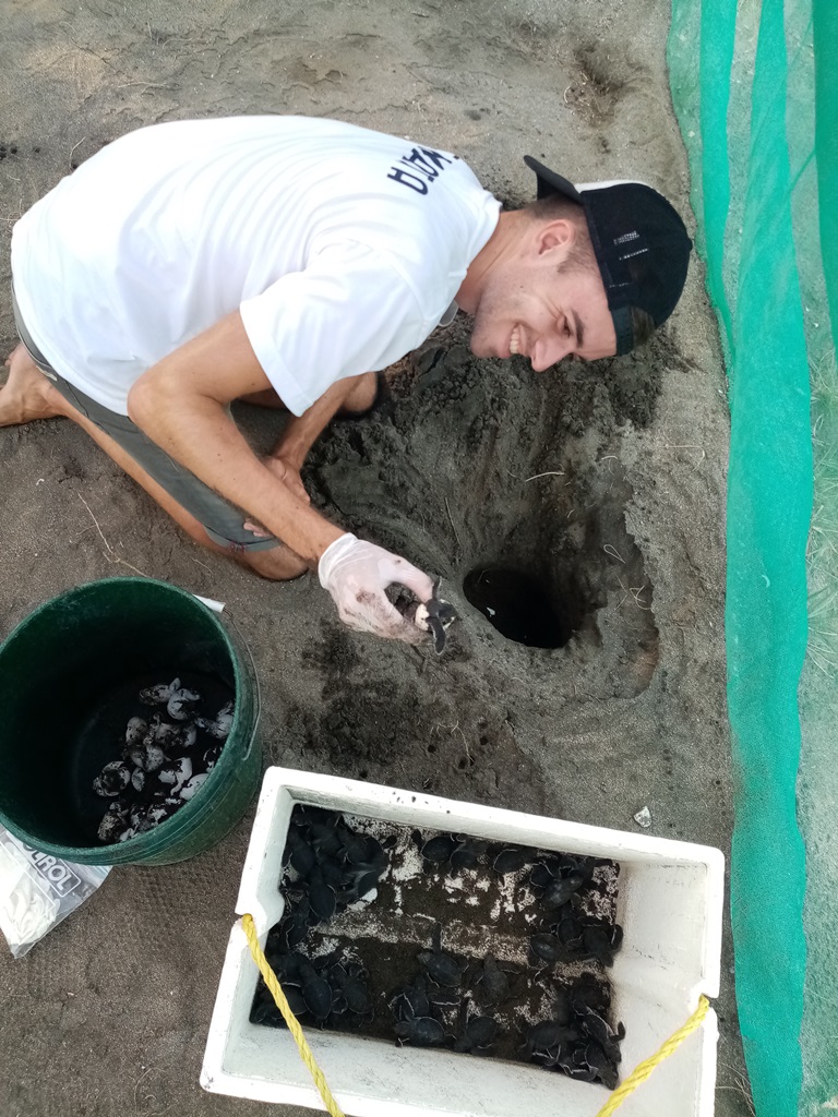 Even though a new year had begun, we still had quite a few nests in the hatchery – both from Olive Ridleys and Green Turtles. Fortunately there were some helping hands around, first the Berg family and then Lennard, a brave soul from northern Germany who decided to do a 3-month internship in the field of geography! Even though Lennard’s focus wasn’t sea turtles, he got trained in nest exhumations and releases. We didn’t go on any more night patrols, but that didn’t stop him from witnessing one legendary nesting event right in front of our property! He saw the turtle dragging herself out of the water, totally unexpected, in the middle of the day, when he was having his midday beach break. What a lucky guy! He immediately called us and we collected the eggs together – it was the last nest of the 2021/2022 season!