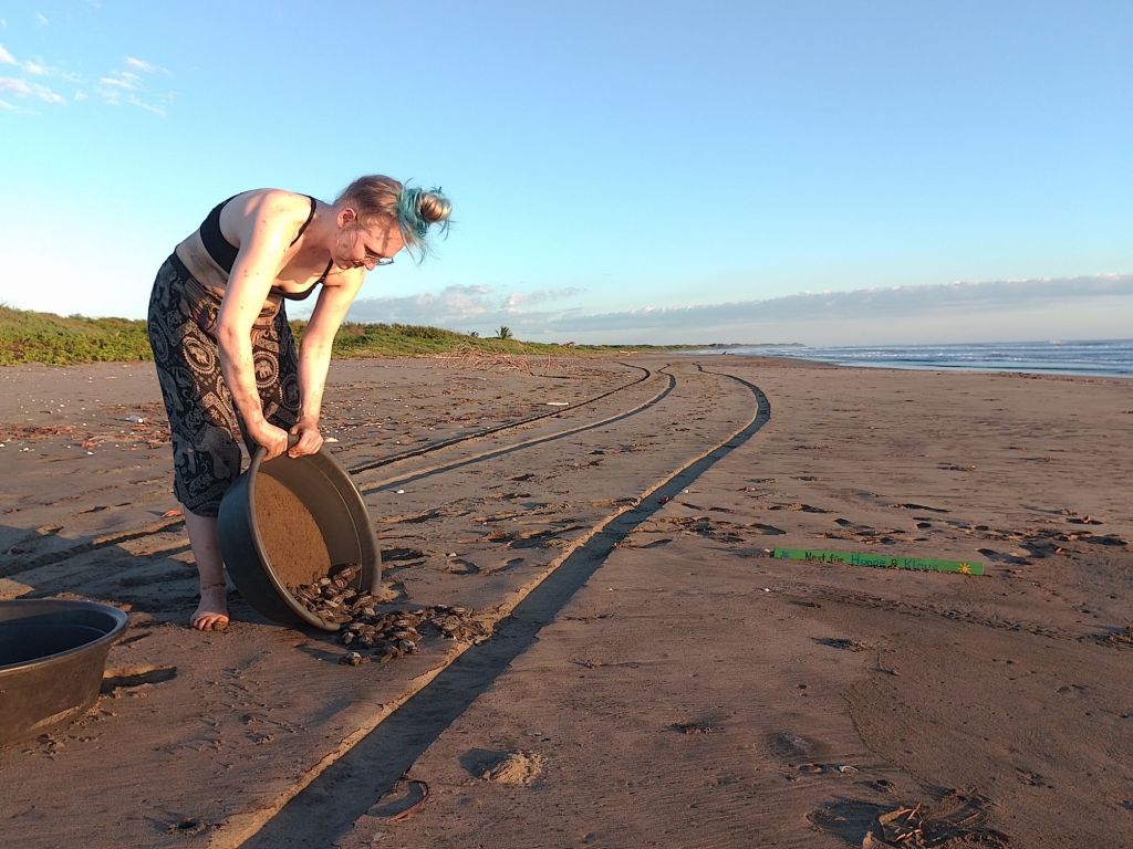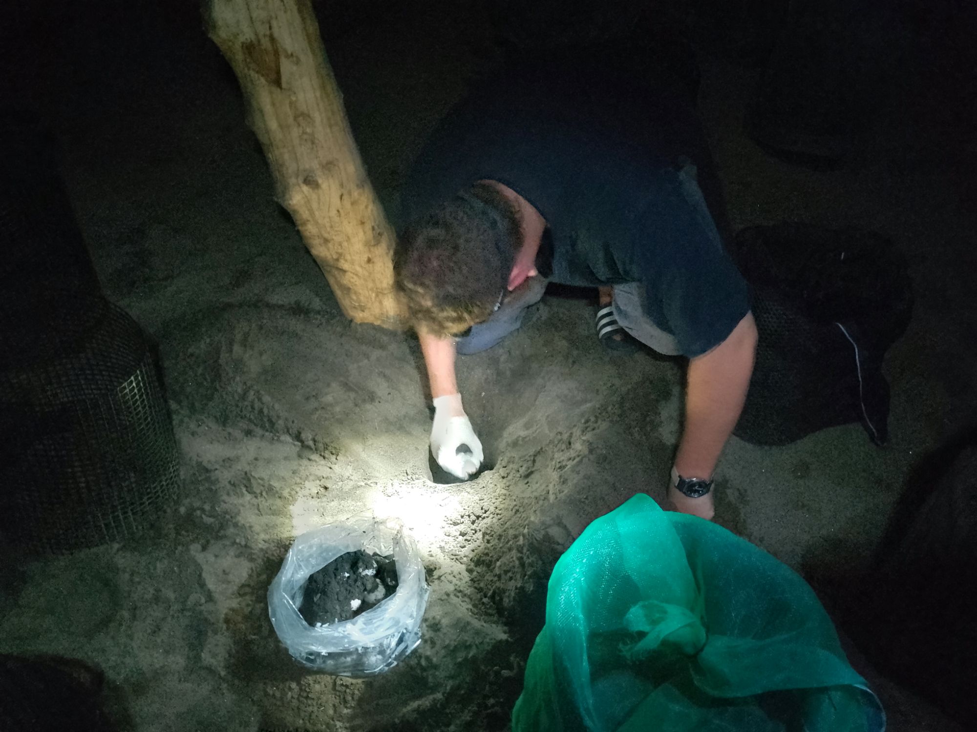There’s nothing that makes me happier than seeing 102 hatchlings emerge from a nest that had 104 eggs! But of course there’s always those nests that have a low percentage: Sometimes you have a lot of undeveloped eggs, sometimes you have a lot of embryos that died mid-term and sometimes there are even dead hatchlings in the sand that didn’t get to the surface in time.