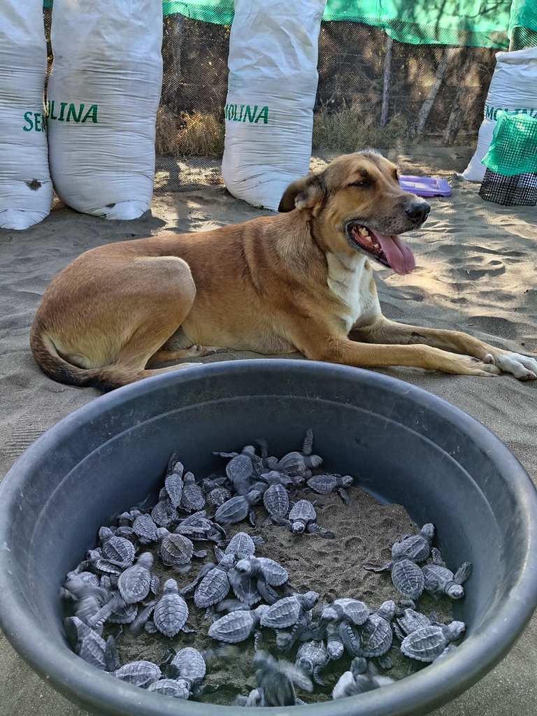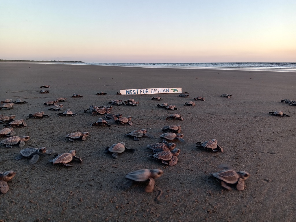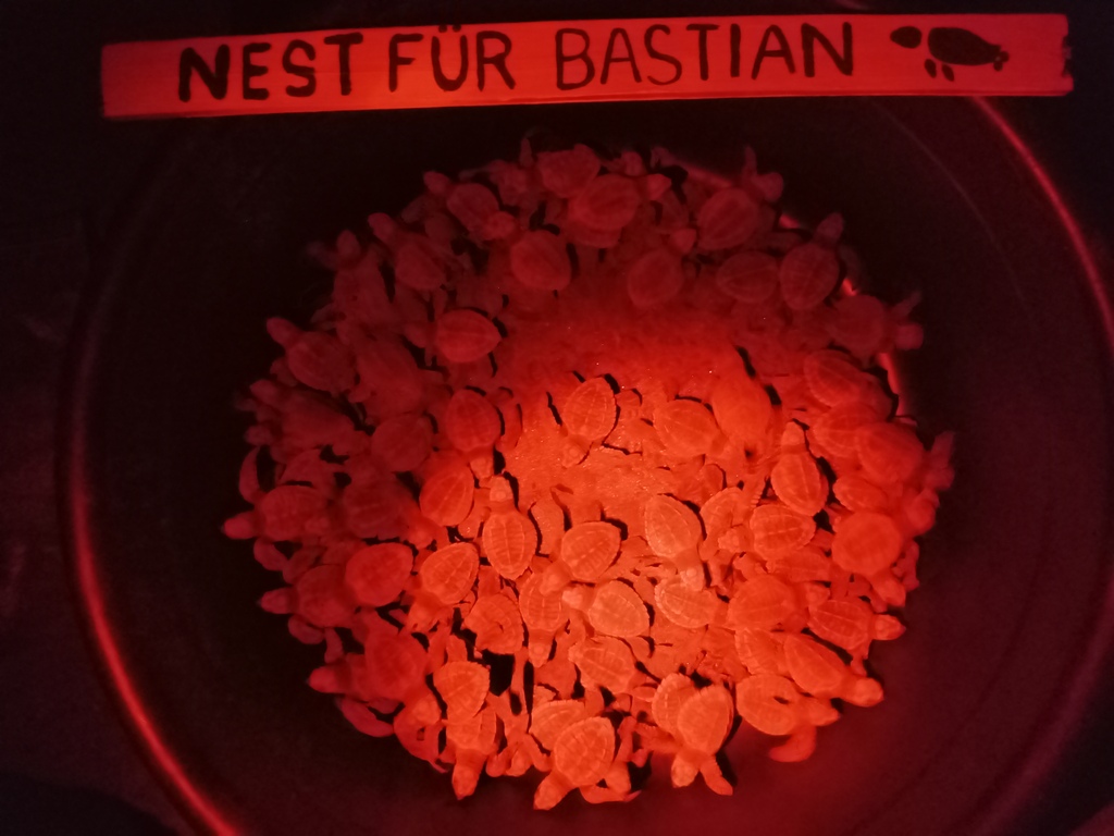 Oh, and we had another MEMANTA First this year: I was finally brave enough to rebury a nest on the beach, outside of our hatchery, to see how a semi-natural nest would turn out. It was pretty stressful to watch over that nest as nobody was allowed to even know about it. Secret nests cannot be marked or fenced, and dogs were constantly sniffing around it once – especially, once the babies were on their way up. Which is, by the way, the time depredation happens quite frequently: Once the eggs are open and the babyturtles move towards the surface, they emit a smell that attracts predators and unfortunately the most-feared predator right now is Knödel – he developed a love for turtles that couldn’t be any more wrong.