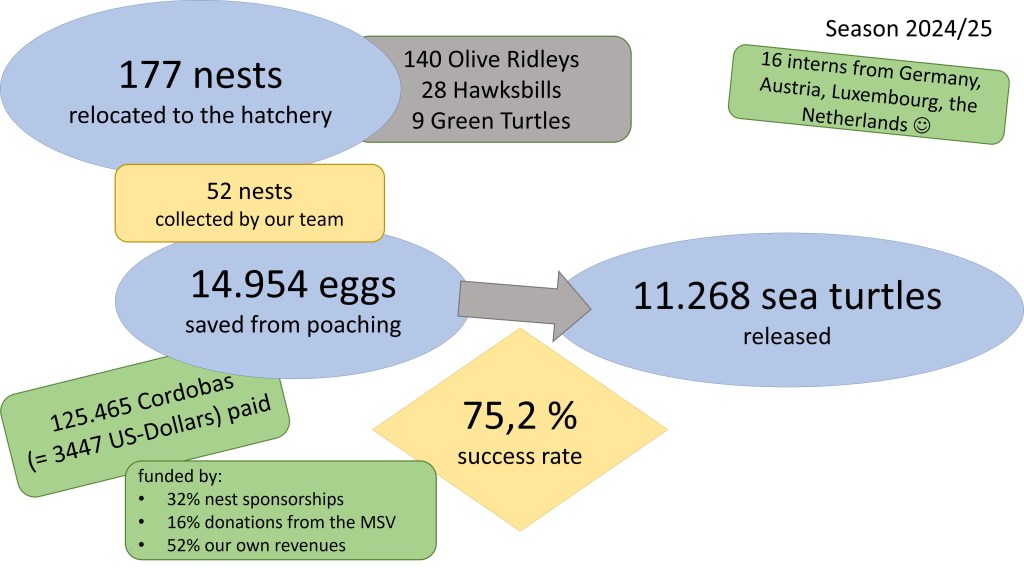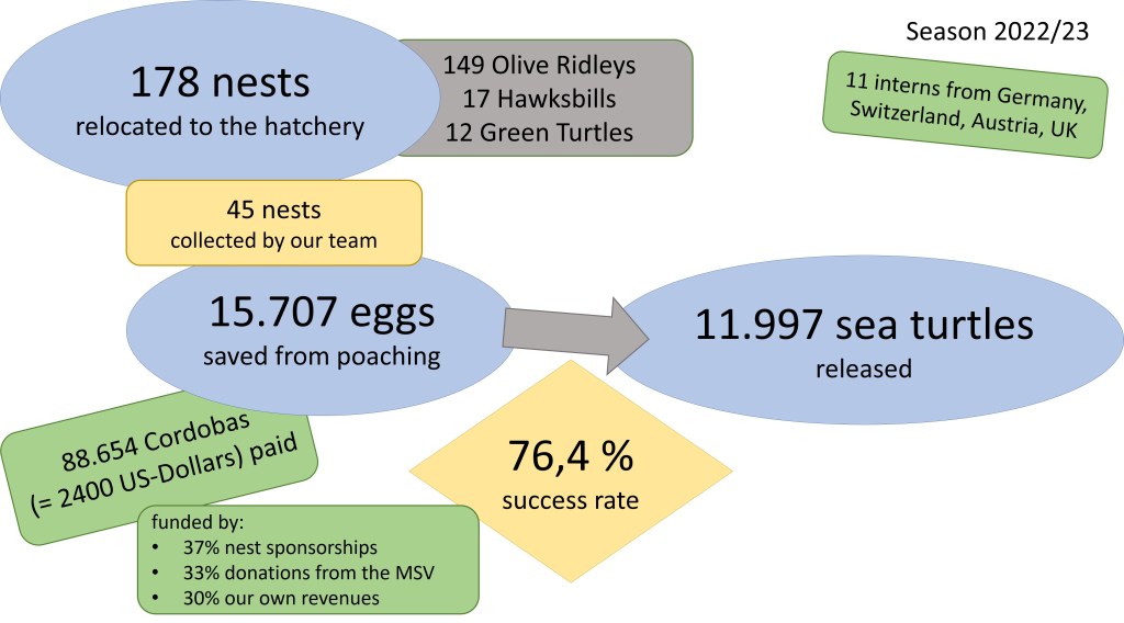 We’ve been operating since 2019. During the season 2021/22 we welcomed our first international volunteers and interns. Our expenses for paying the local egg collectors are covered by the participation fees, by nest sponsorships and by donations from the german NGO <MSV Nicaragua>.