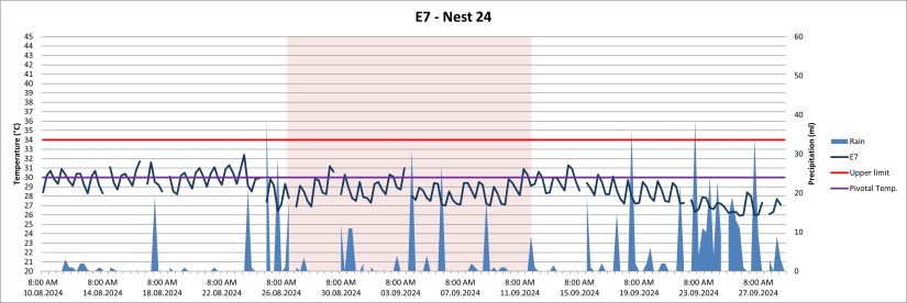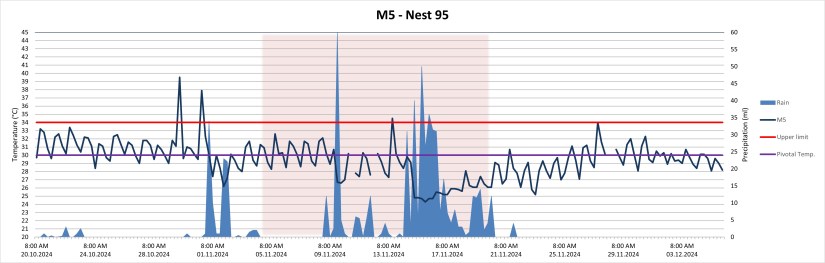 This nest had its sex determination period when the big rain hit. You can see that the differences between day and night temperatures are bigger than in M5, following the up’s and down’s of the daily air temperatures.