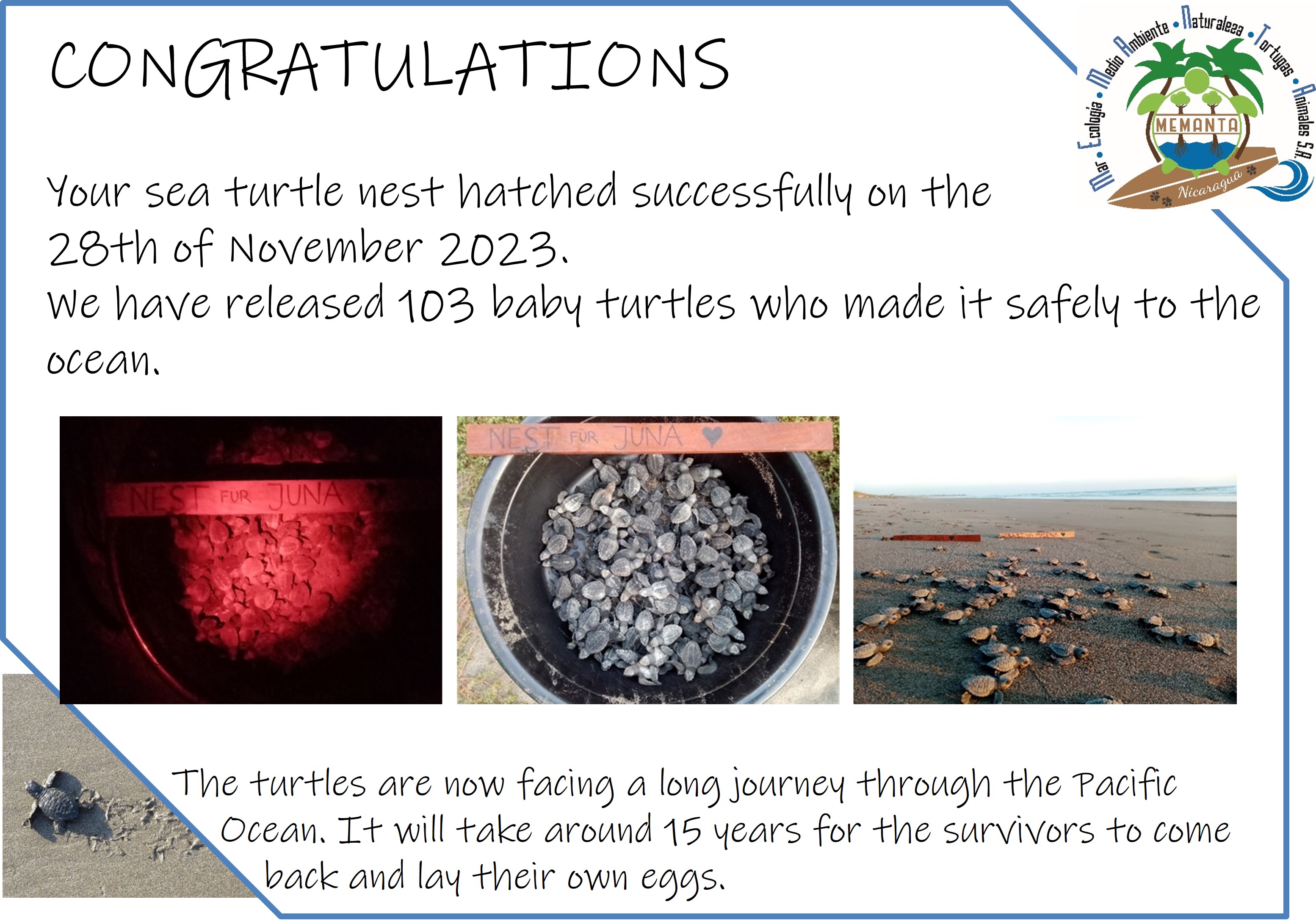 - Pictures of the hatchlings (might be taken at nighttime with red light)