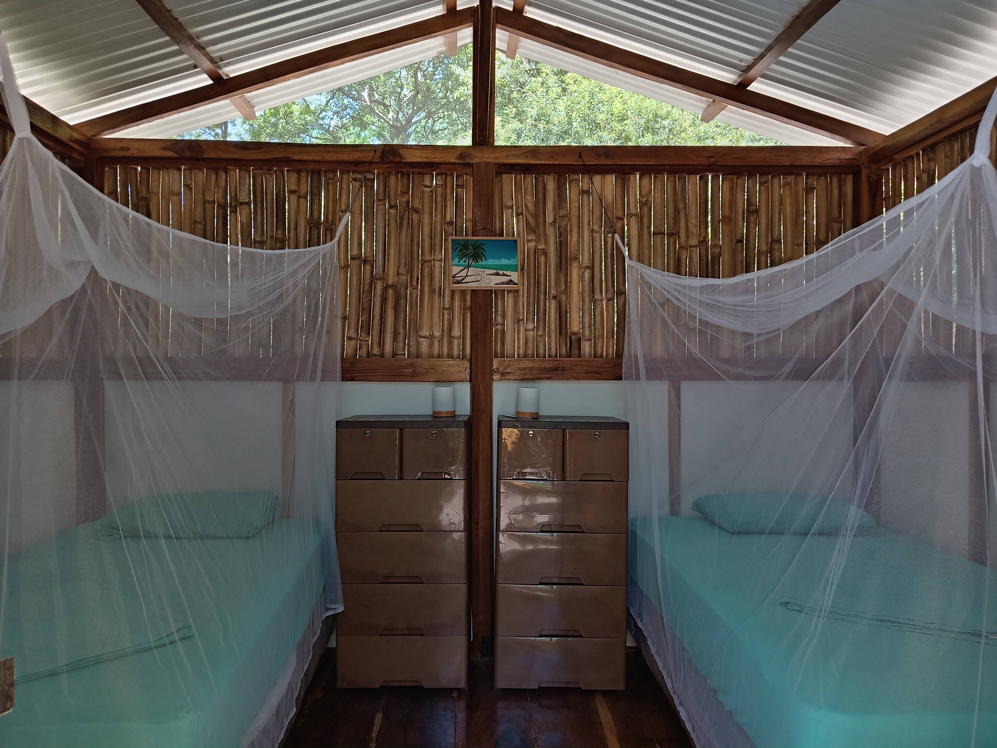 The Cabaña has 3 beds (plus one optional air mattress) and the Cabañita has 2 beds that can be joined for couples. Both cabins have NO electricity, but solar lamps and small rechargeable fans.